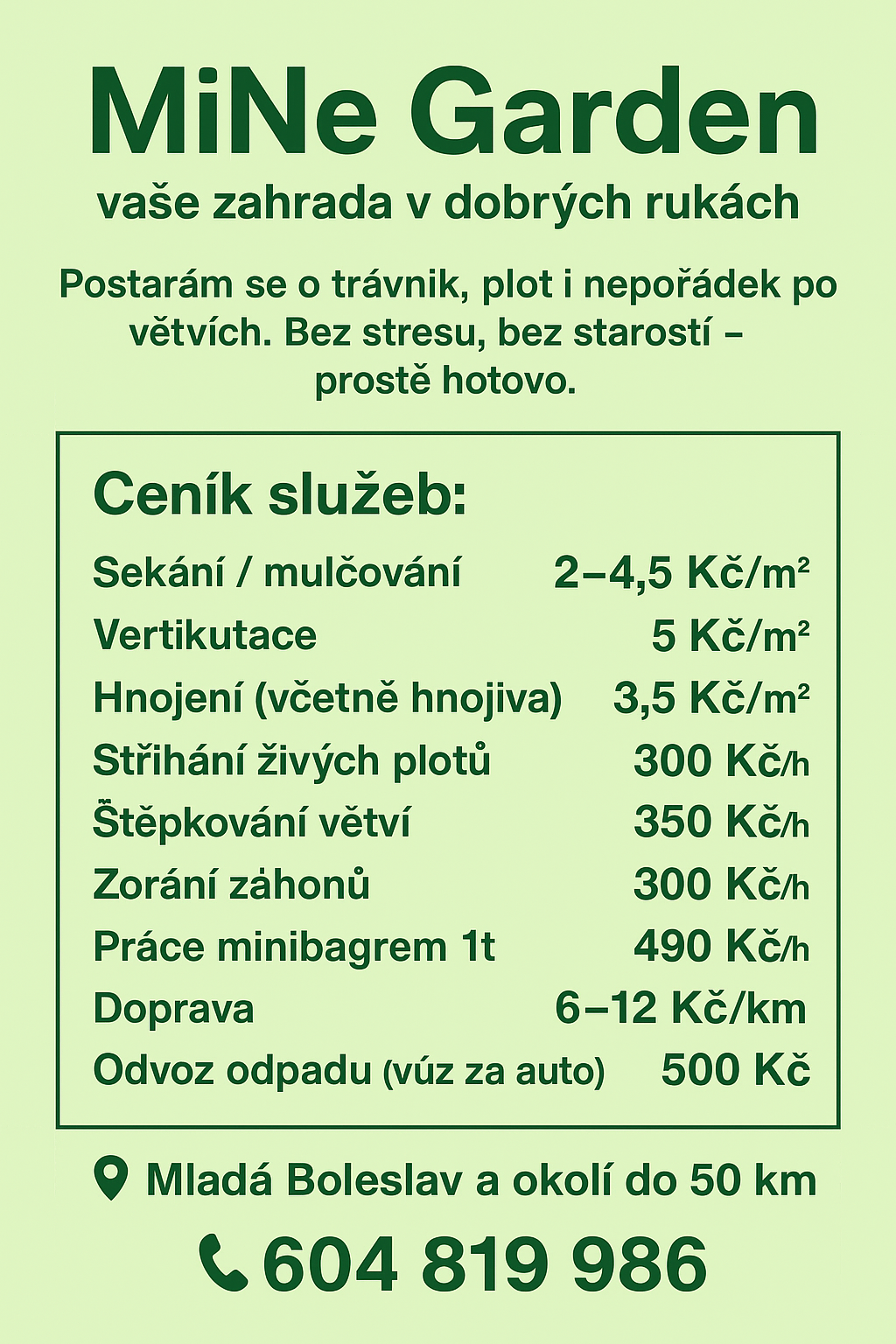 Naše služby MiNe Garden se specializují na sekání trávníku a údržbu zelených ploch, likvidaci křovin, štěpkování, mulčování větších ploch. Ceny slouží pro lepší představu, zaleží ale hlavně na velikosti udržované plochy a v jak moc zarostlém stavu je.